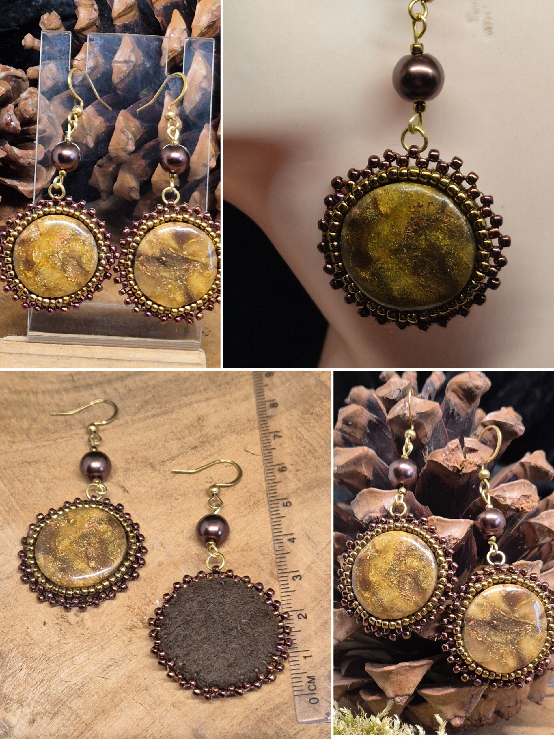 Oorbellen gemaakt van fimoklei op vilt met rondom geregen kralen.